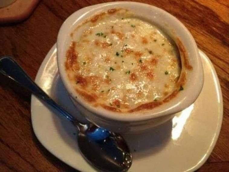The onion soup should simmer for about five minutes until the cheese has melted. Stir continuously.