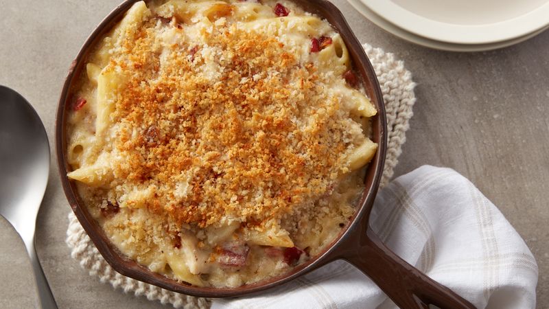 - 4In small bowl, mix bread crumbs and 1 tablespoon melted butter. Sprinkle over top of pasta mixture. Bake 14 to 17 minutes or until bubbly and golden brown.