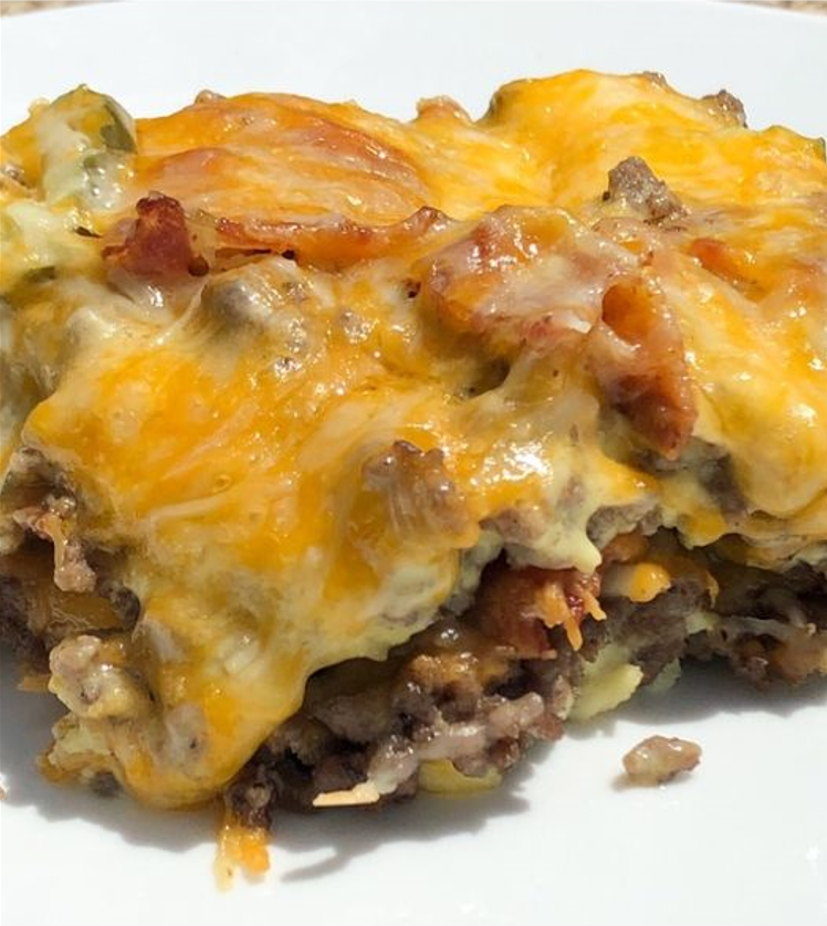 10. In a medium bowl, mix together eggs, heavy cream, and 1 cup of shredded cheese. Mix them together, then pour them evenly over the beef and bacon.