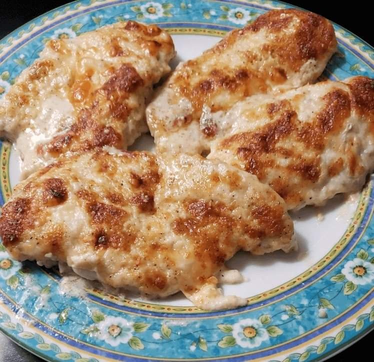 In a bowl mix mayonnaise, sour cream, ½ cup Parmesan cheese, salt, pepper and garlic powder. Spread this over chicken and sprinkle with remaining Parmesan cheese.