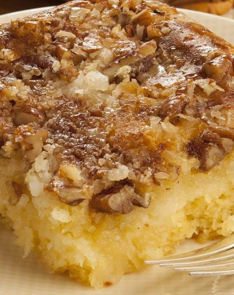 Pour batter over pecan mixture in prepared pan and bake until a toothpick inserted into the center comes out clean, about 35-40 minutes.