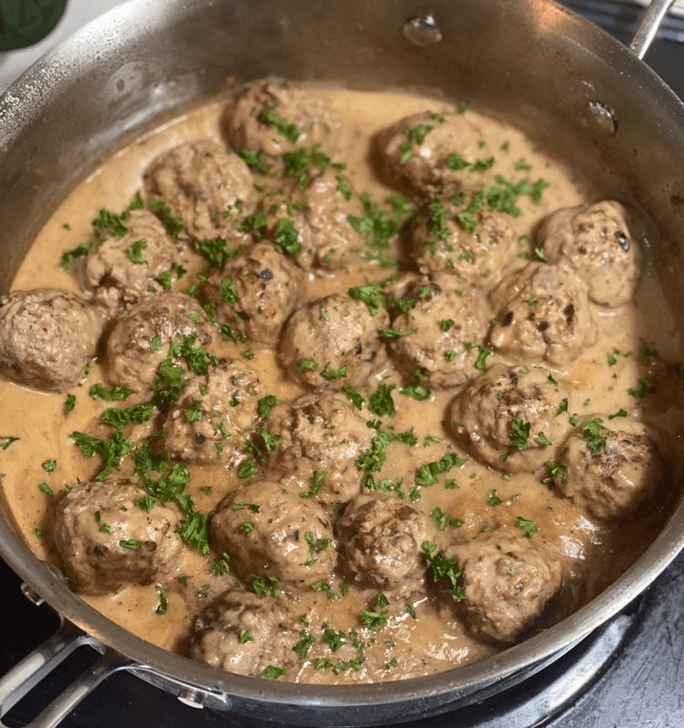 - Step 5 To make brown gravy, pour pan drippings into a saucepan over medium heat. Whisk the flour into the pan drippings until smooth, and gradually whisk in enough beef broth to total about 2 1/2 cups of liquid. Bring the gravy to a simmer, whisking constantly until thick, about 5 minutes. Just before serving, whisk in the sour cream. Season to taste with salt and black pepper. Serve the gravy with the meatballs.