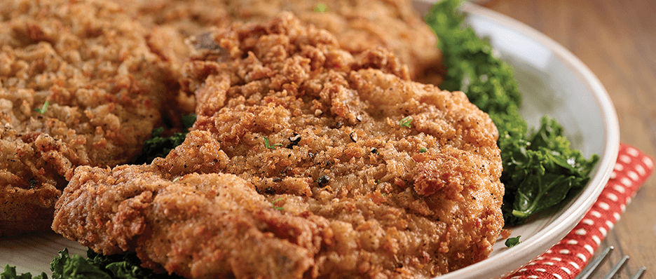 Pour oil into Dutch oven until 2 inches deep. Heat over medium-high heat until temperature reaches 300oF. Carefully place coated chops into hot oil. Fry until chops are browned and internal temperature reaches 150F., 10 to 15 minutes, turning occasionally.
