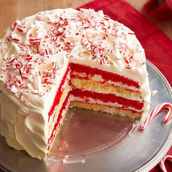 This frosty peppermint masterpiece is the perfect finale to any feast. Alternating red and white layers dressed with white chocolate frosting decorate every slice of the make-ahead dessert recipe, and the festive colors make it a stunning Christmas cake.
