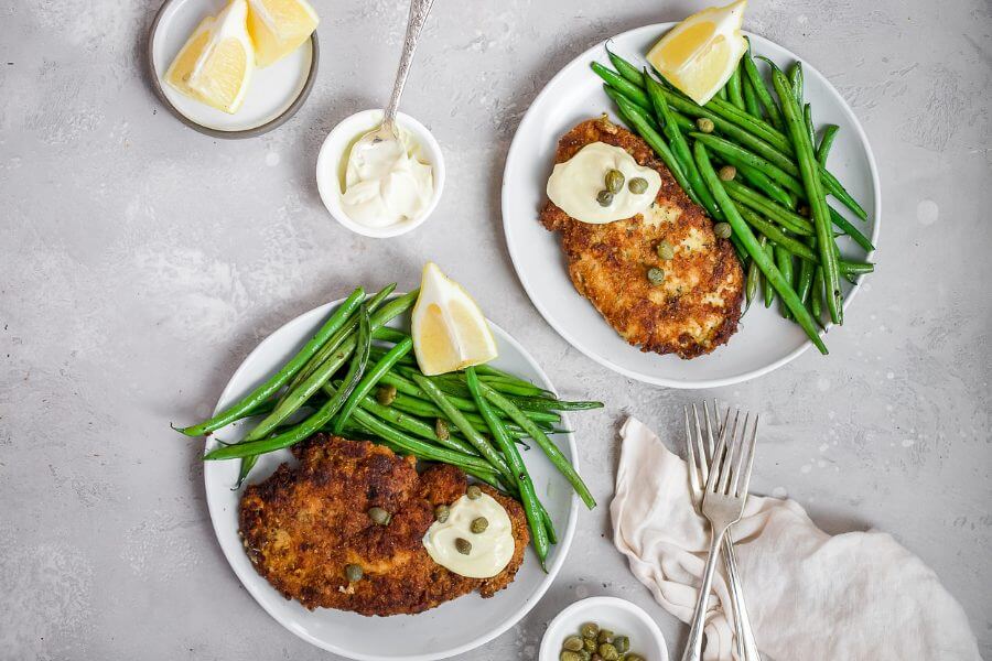 This makes a total of 4 servings of Keto Schnitzel with Green Beans. Each serving comes out to be 854 calories, 59.2g fat, 8.9g net carbs, and 66.2g protein.