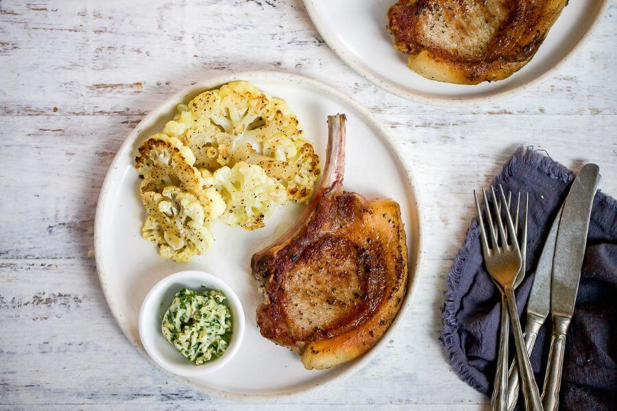 Serve the pork chops with the roasted cauliflower and the herbed butter. Enjoy!