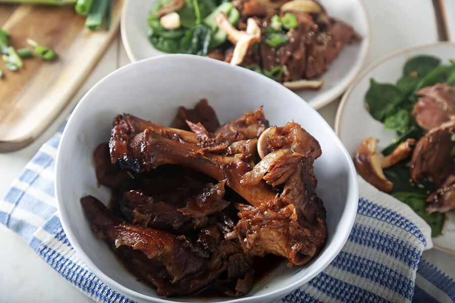 Remove the pork hock from the slow cooker and de-bone it. Slice it as you want, and add it back to the sauce in the crock pot. Stir it up well so the pork can absorb some more flavor.