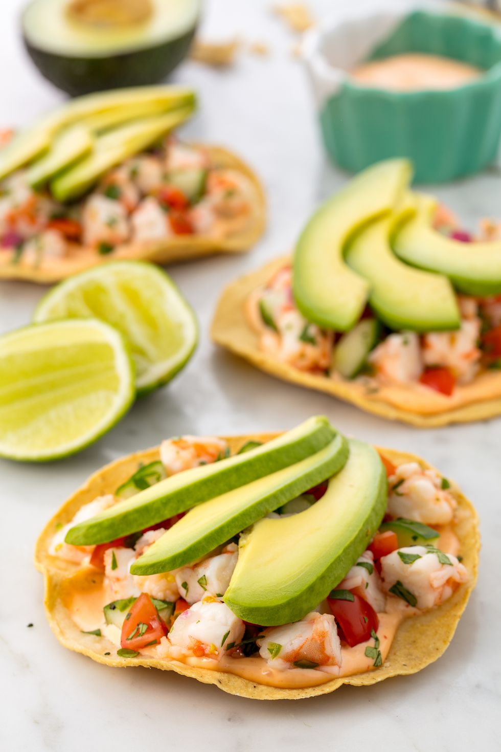 In a small bowl, mix together mayo and hot sauce. Spread spicy mayo onto tostadas, then add ceviche.