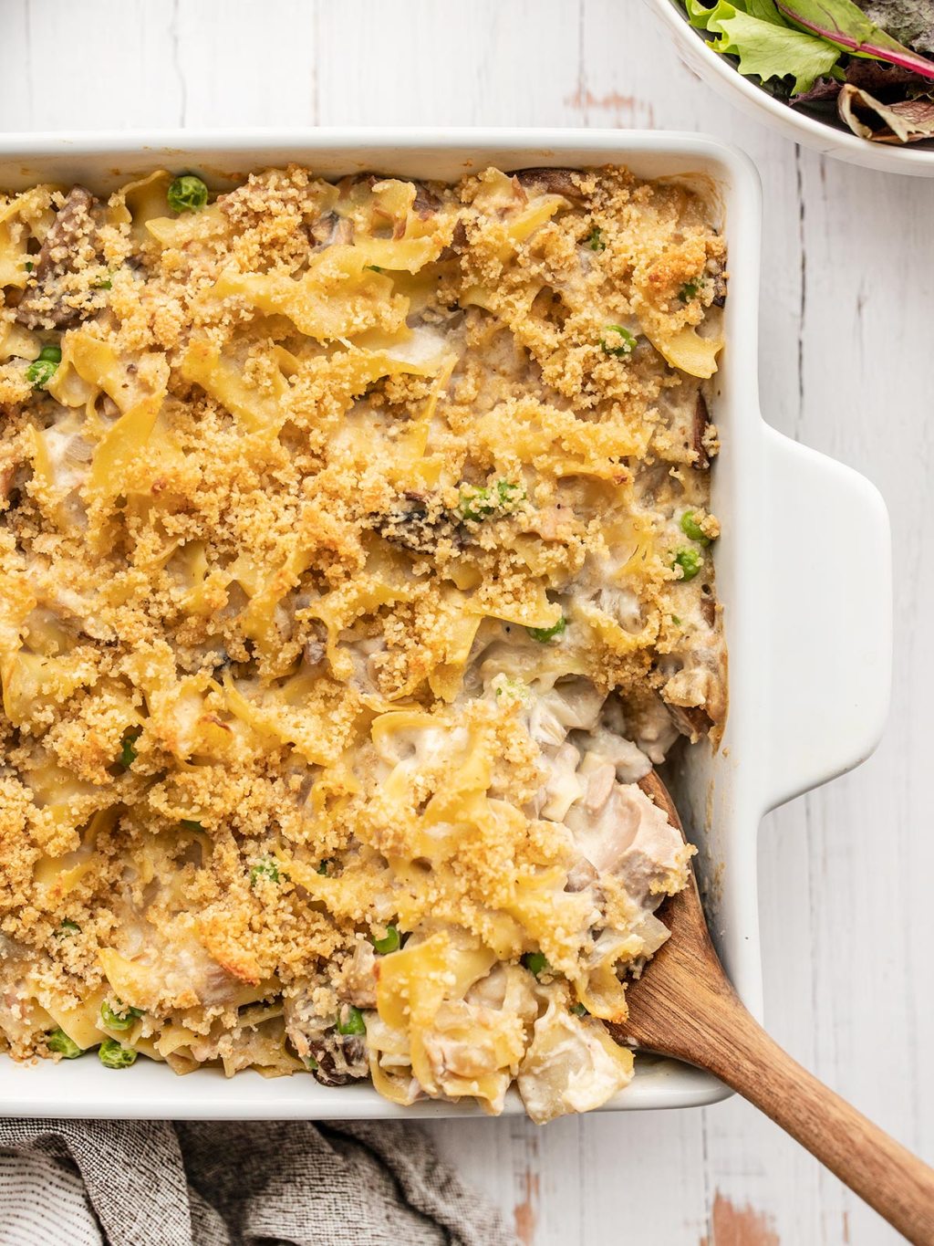 Transfer the casserole mixture to a 3 quart casserole dish, then top with the breadcrumb topping.