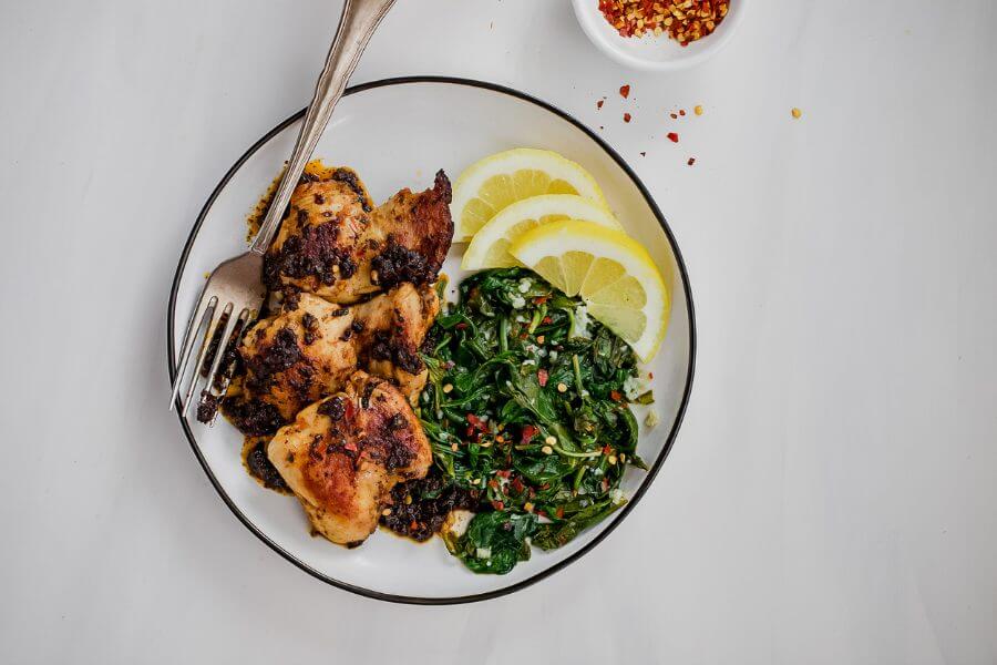 While the chicken is soaking up the marinade, add olive oil to to a frying pan over medium heat. Add in the other half of the minced garlic and the spinach. Sautee for 2 – 4 minutes. Season with salt and pepper and crushed red pepper flakes. Set this aside when done.