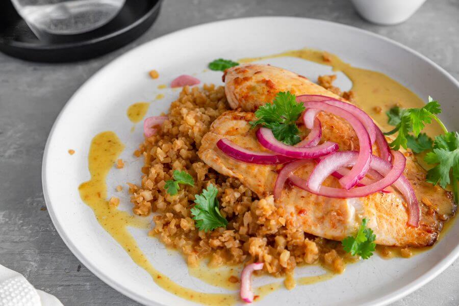 Serve the fish over the cauliflower rice. Garnish with the sauce, onions, and cilantro. Serve and enjoy!
