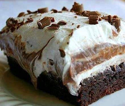 Mix brownie mixes according to directions. Add egg. Bake in brownie pan. 9×13 Mix cream cheese, powdered sugar and 1 container whipped topping. Put this mix on top of the cooled brownies. Blend puddings and milk together and put on top of the cream cheese mixture. Top with another layer of whipped topping. Put chocolate shavings or chocolate syrup on top. Refrigerate until ready to serve. Enjoy!