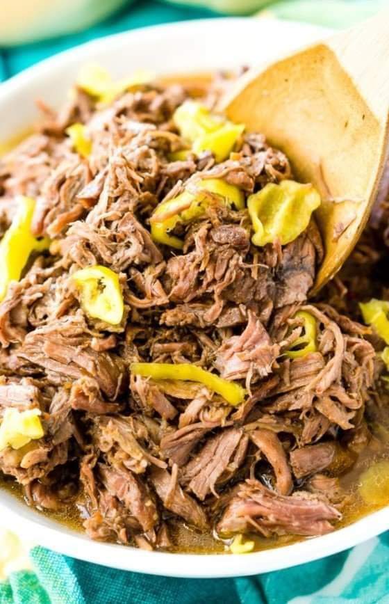 With an hour left in the cooking process, remove the bay leaf and shred the meat, let cook for the remaining hour. Enjoy as a sandwich with pepperoncini, provolone, and au jus or over rice or mashed potatoes.